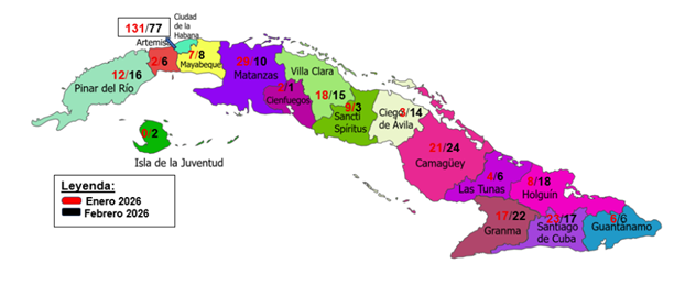 • La Habana con 77 reportes, mostrando disminución en 5 casos comparada con febrero del año 2025 y continúa siendo la más afectada acumulando más del 31 % del total reportados en este mes de febrero de 2026. Seguida de: